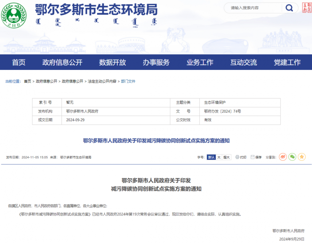 11月5日,鄂尔多斯环境局k8凯发官网发布鄂尔多斯市人民政府关于印发减污降碳协同创新试点实施方案的通知。