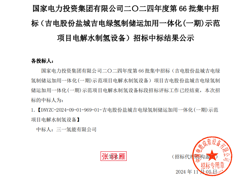 11月5日,国家电力投资集团有限公司二〇二四年度第66批集中招标(吉电股份盐城吉电绿氢制储运加用一体化(一期)示范项目电解水制氢设备)招标中标结果公示,三一氢能预中标。
