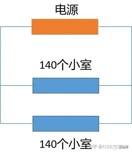 在这小室电压取目前的经验值,在3000 a/m2的电流密度下小室电压e0取1.85 v,且电解槽采用“中间正,两边负”的接线方式,相当于140个小室串联,另外140个小室串联,这两套140个小室之间是并联关系,关系如下图所示。