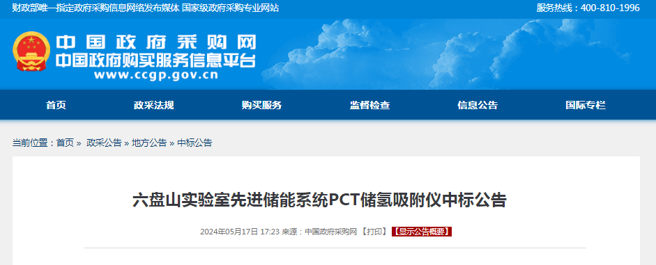 据悉,该公告明确指出,项目名称为六盘山实验室先进储能系统pct储氢吸附仪,中标(成交)供应商为贝士德仪器科技(北京)有限公司,中标(成交)金额为708000.00元。