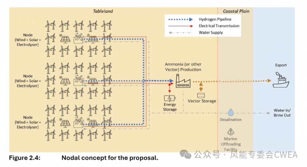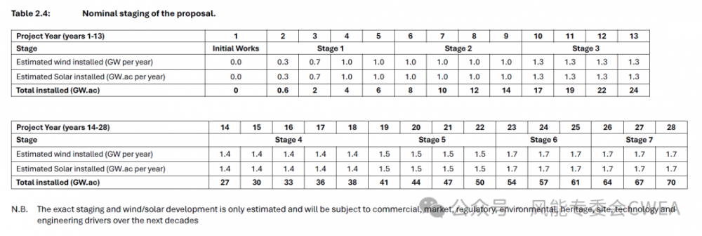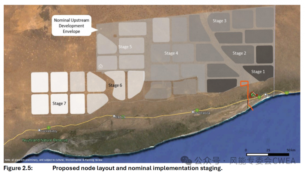 开发商计划在西澳大利亚米尔宁县的金矿区-埃斯佩兰斯地区,占地 229 万公顷(超过 22000 平方公里),包括牧场租赁地和皇家土地,计划建设35 个太阳能光伏发电场,预计将安装多达 6000 万块光伏组件。另外,项目还将安装 3000 台风电机组,预计单机功率从 7 mw到 20mw。计划显示,整个项目将划分为一个个“节点”,每个节点包含约 2 gw 至 3 gw 的太阳能和风能发电,在每个节点的中心位置安装一个约 1.5 gw 容量的氢电解设施。提议的西部绿色能源中心(wgeh)占地面积和关键要素细节开发商表示,项目全面开发后,每年可产生超过 200 twh 的可再生能源,具体将取决于风能和太阳能组合的比例。 wgeh公司表示,项目的发电规模与澳大利亚目前的总发电量差不多,有望为澳大利亚国内和国际绿色燃料的供应以及最终的国内电力分配提供机会。开发商表示,风光发电作为低成本的清洁能源,可用于“多种用途”,包括每年生产约 350 万吨绿氢,供当地、区域和国际使用。另外,提案表示出口则以绿氨的形式。可再生绿色能源中心流动路线:可再生电力——氢能生产和存储——氨的生成和存储——出口市场该项目还包括数据中心、生产车间和制造工厂、可容纳约 8000 名员工的居住区以及通往海岸的基础设施走廊。沿海和近海部分则包括一些海上卸货工厂、海水淡化厂、盐水管道和绿氨(或其他能源载体)的出口管道等。wgeh将覆盖22700平方公里的沿海沙漠土地,这比斯洛文尼亚和萨尔瓦多等国家的面积还大。据透露,wgeh 将分为七个阶段实施,最终投资决定(fid)预计在 2029 年完成,总耗资约 1000 亿澳元(合655.8 亿美元),并预计在 2032 年左右首次投产。wgeh 将分为七个阶段实施,头13年包括启动工作1年和1-3阶段各3年,后14-28年,包括第四阶段5年,第五阶段4年,第六和第七阶段各三年。各阶段风光装机容量分布如上表。今年9月3日,wgeh宣布与韩国电力公司 (kepco)签署了合作协议,韩国公司将支持该项目的发展,此后,更新到70gw总装机容量的项目计划已提交西澳大利亚进行环境审批。与韩国电力签署的协议根据双方在2021年就签署的谅解备忘录,对项目进行了详细的审查,并进行了全面的可行性研究,旨在指导该项目第一阶段的进一步开发工作。预计该项目第一阶段的工作包括约 6 gw的太阳能和风能项目的开发,该阶段目标是为每年可生产高达 33 万吨绿氢的氢电解槽提供电力。wgeh 第一阶段对于将澳大利亚定位为全球新兴绿氢领域的主要参与者具有重要意义,同时也有助于满足韩国市场的新兴需求。投资者之一米尔宁绿色能源是西澳大利亚米尔宁传统土地原住民公司 (mtlac) 的子公司,该公司是注册的原住民所有权的代表机构。作为本地原住民,未来也将从这一大型项目中获得收益。总部位于香港的洲际能源公司专注于开发超大型能源项目,包括阿曼的 25 gw项目。该公司还与 cwp 合作计划开发澳大利亚的一个 26 gw的大型风光项目,bp也是该项目的一个大股东。今年10月29日, 西澳大利亚州政府发布了最新的可再生氢能战略(western australia's renewable hydrogen strategy 2024–2030),重点关注投资基础设施和激活枢纽、加快审批和加强社会许可,以及支持战略性绿氨和绿色金属项目。(参考:https://www.wa.gov.au/government/publications/western-australias-renewable-hydrogen-strategy-2024-2030)在与主要利益相关者协商后制定的更新后的氢能战略,吸纳了反馈意见,以更加关注审批、基础设施和土地、市场激励措施、为地区社区和原住民提供价值以及更新的目标和指标。自 2017 年以来,西澳工党政府已拨款超过 54 亿美元支持能源转型,包括西澳主要电网(西南互联系统和西北互联系统)的新的发电、输电和储能项目。 wgeh向政府提交的提案详情