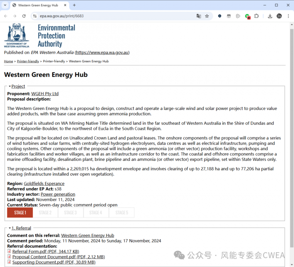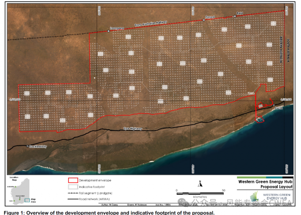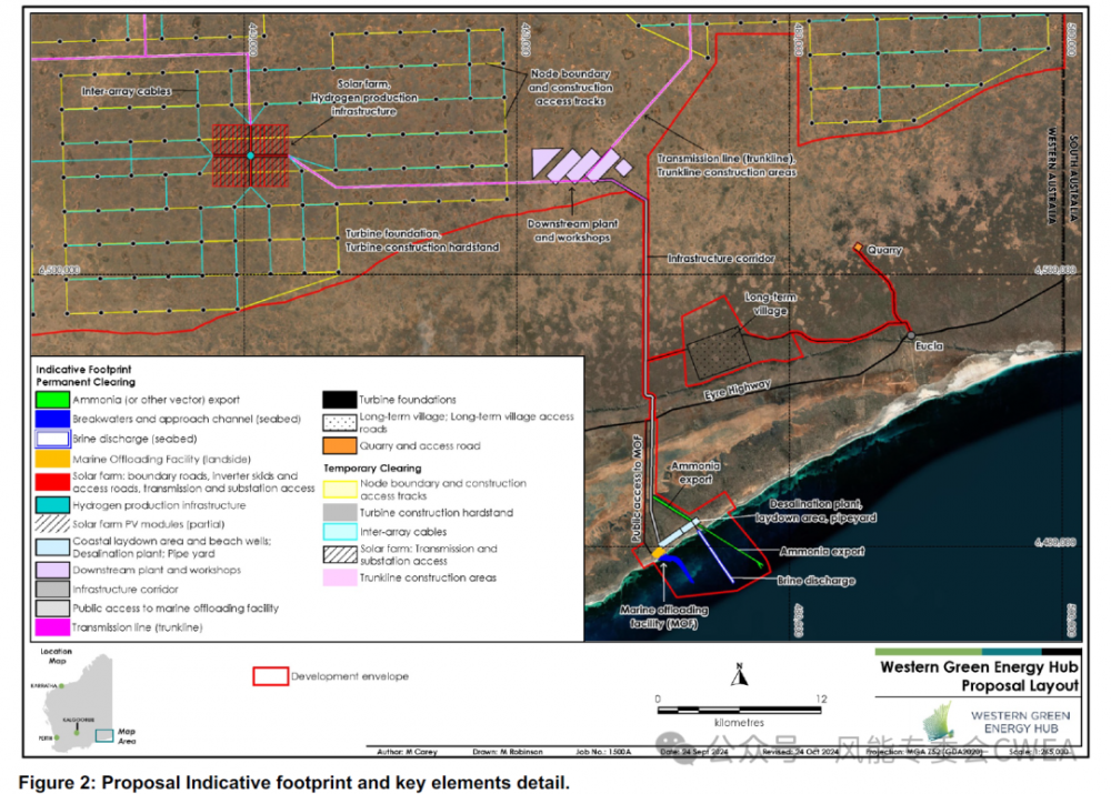 西部绿色能源中心(western green energy hub)提案提案描述:西部绿色能源中心计划设计、建造和运营一个大型风能和太阳能发电项目,以生产增值产品,基本情况是生产绿色氨。项目位于西澳大利亚州东南部邓达斯郡和卡尔古利-博尔德市西澳米尔宁原住民土地所有权确定的土地上,位于南海岸地区尤克拉的西北部。该项目将位于未分配的皇家土地和牧场租赁地上。该项目的陆上部分将包括一系列风力发电机组和太阳能发电场,以及位于中心位置的氢电解槽设备、数据中心以及电力基础设施、泵送和冷却系统。该项目的其他部分还将包括绿氨(或其他能源载体)的生产设施、车间和制造设施和工人居住区,以及通往海岸的基础设施走廊。沿海和海上部分包括海上卸货设施、海水淡化厂、盐水管道和氨(或其他能源载体)的出口管道,仅设置在州水域内。该提案位于 2,269,015 公顷的开发范围内,涉及清理多达 27,188 公顷的土地和清理多达 77,206 公顷的部分土地(在开放植被上安装基础设施)。地区:金矿区埃斯佩兰斯(goldfields esperance)
