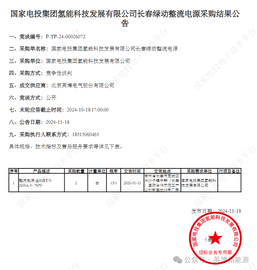 2024年11月19日,北京英博新能源有限公司(简称“英博新能源”)的母公司——北京英博电气股份有限公司(简称“英博电气”)成功中标国家电投集团氢能科技发展有限公司长春绿动整流电源采购项目,英博以其产品及方案所具备的稳定性和实用性在众多竞标者中脱颖而出。
