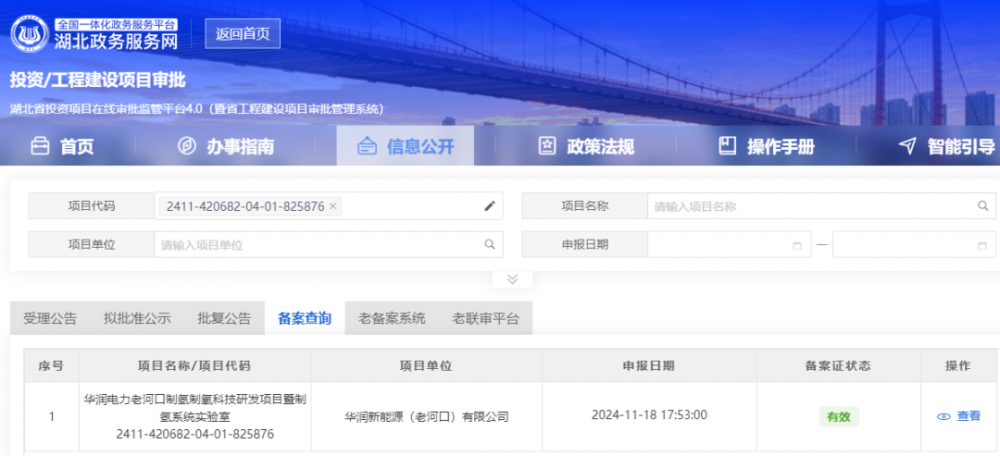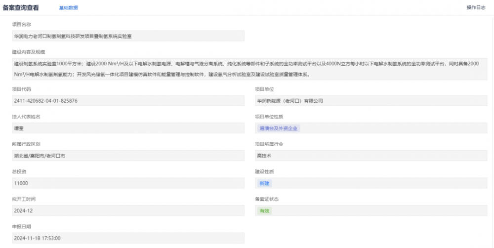 近日,据湖北政务服务网消息,11月18日,华润电力老河口制氢制氧科技研发项目暨制氢系统实验室完成备案。