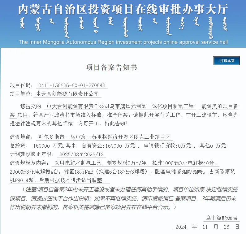 11月26日,内蒙古投资项目在线审批办事大厅发布氢能项目重磅备案信息: