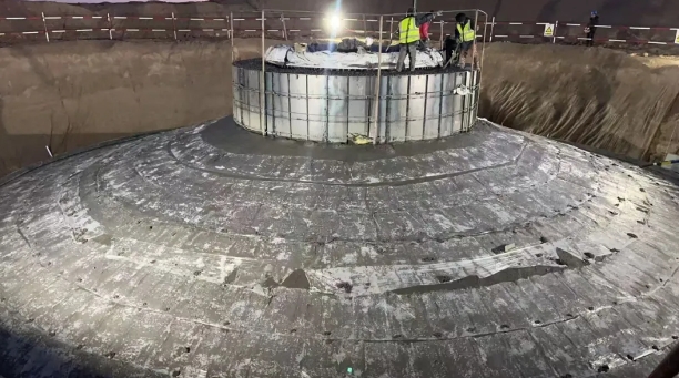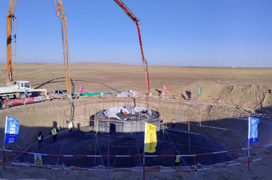 本项目风电机组采用圆形现浇钢筋混凝土扩展基础,开挖深度4.5米,基础钢筋用量近80吨,混凝土用量近750方,首台基础于2024年11月16日开挖,11月28日开始浇筑。为了确保基础一次性浇筑完成,建设单位、监理单位、总包单位提前做好各项准备工作,严格审查大体积混凝土浇筑技术方案、冬季施工方案以及相关应急预案。