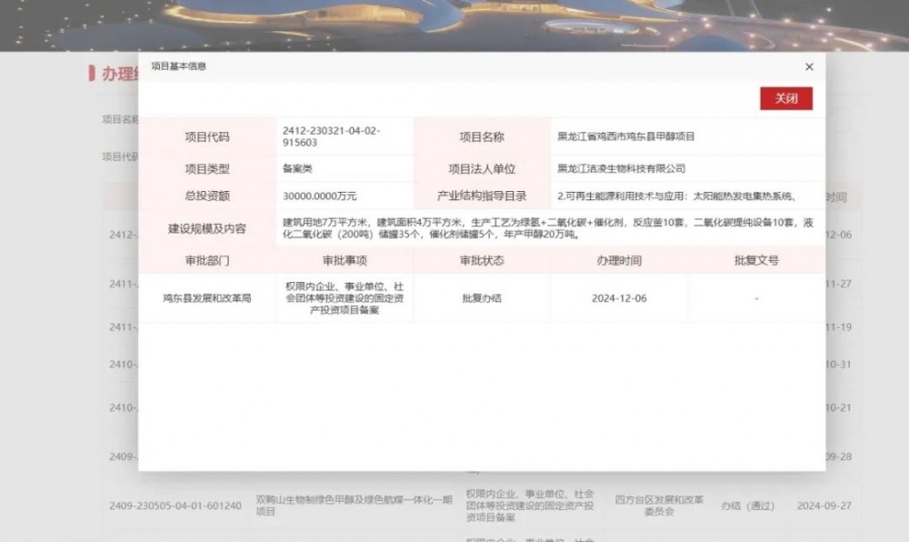 同日,该公司黑龙江省鸡西市鸡东县甲醇项目也成功备案了。甲醇项目主要建设建筑用地7万平方米,建筑面积4万平方米,生产工艺为绿氢 二氧化碳 催化剂,反应釜10套,二氧化碳提纯设备10套,液化二氧化碳(200吨)储罐35个,催化剂储罐5个,年产甲醇20万吨。