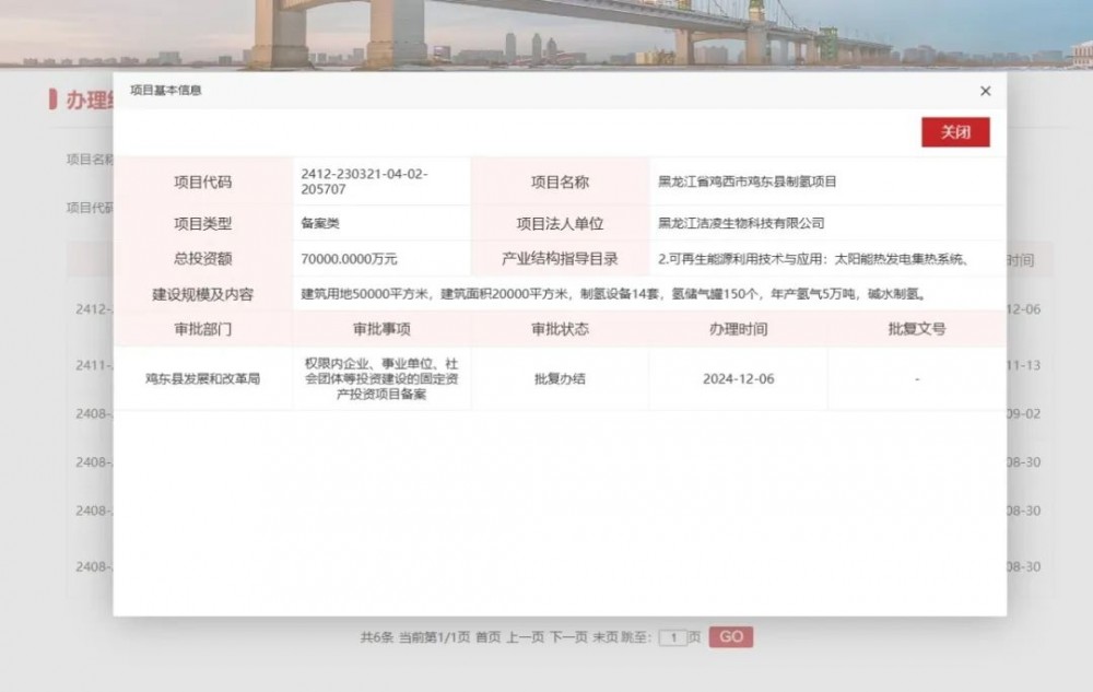 12月6日,黑龙江省投资项目在线审批监管平台发布信息:黑龙江省鸡西市鸡东县制氢项目完成备案。项目法人单位黑龙江洁凌生物科技有限公司,总投资额7亿元,建设规模及内容为建筑用地50000平方米,建筑面积20000平方米,制氢设备14套,氢储气罐150个,年产氢气5万吨,碱水制氢。