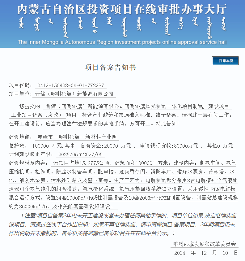 晋储(喀喇沁旗)新能源有限公司提交的晋储(喀喇沁旗)新能源有限公司喀喇沁旗风光制氢一体化项目制氢厂建设项目,符合产业政策和市场准入标准,准予备案。