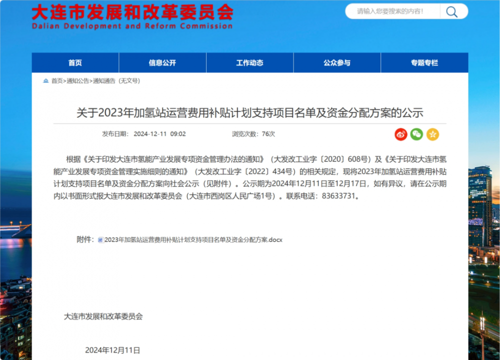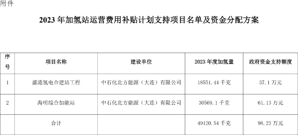关于2023年加氢站运营费用补贴计划支持项目名单及资金分配方案的公示 根据《关于印发大连市氢能产业发展专项资金管理办法的通知》(大发改工业字〔2020〕608号)及《关于印发大连市氢能产业发展专项资金管理实施细则的通知》(大发改工业字〔2022〕434号)的相关规定,现将2023年加氢站运营费用补贴计划支持项目名单及资金分配方案向社会公示(见附件)。