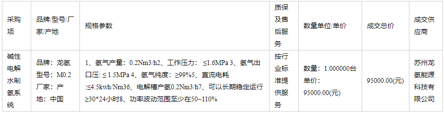 12月11日,碱性电解水制氢系统采购结果发布。采购单位为东南大学,成交供应商为苏州龙氢能源科技有限公司。