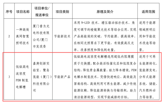 2024年12月20日,鹭岛氢能核心产品“低铱高电流密度pem制氢电解槽”,入选福建省能源领域节能新技术新产品新装备推广目录(以下简称目录)!全省仅4项!