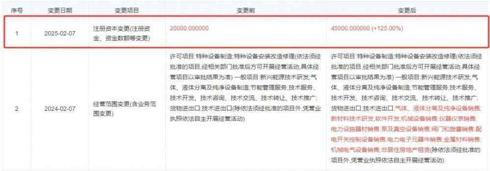 近日,无锡隆基氢能科技有限公司发生工商变更,注册资本由2亿元人民币增至4.5亿元人民币,增幅125%。该公司成立于2021年4月,法定代表人为李振国,经营范围含特种设备制造;新兴能源技术研发;气体、液体分离及纯净设备制造等。