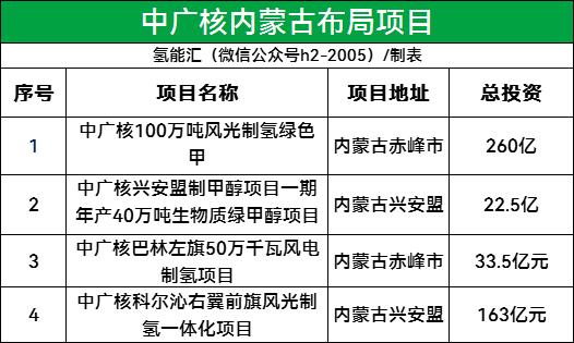 氢能汇(微信公众号:h2-2005)获悉,截至目前,中广核在内蒙古已布局多个绿氢项目,利用可再生能源进行电解水制氢,以实现低碳甚至零碳排放的氢能生产。