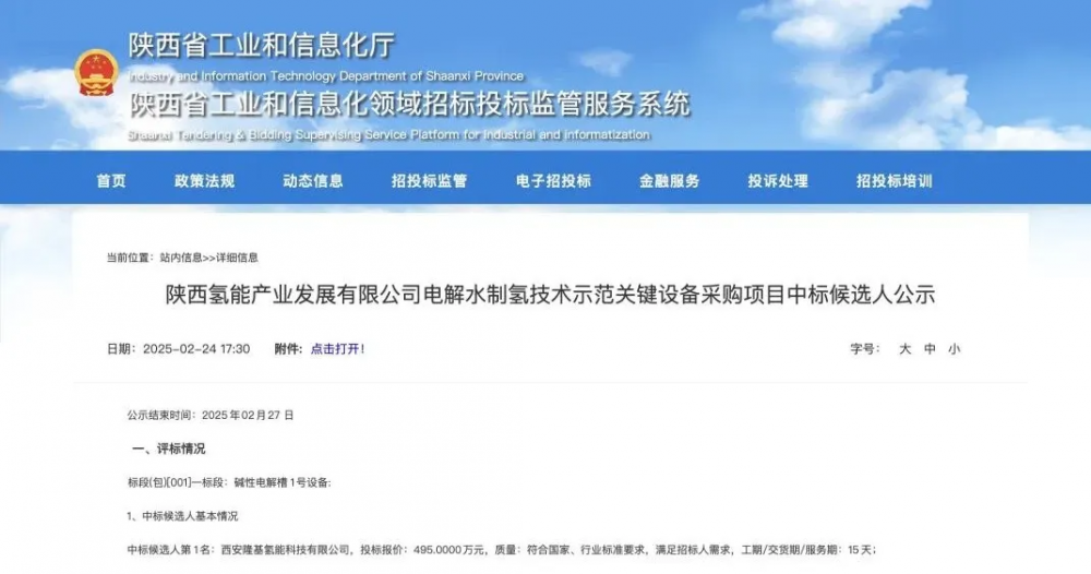 2月24日,陕西氢能产业发展有限公司(以下简称“陕西氢能”)电解水制氢技术示范关键设备采购项目正式公示,隆基氢能凭借领先的科技实力成功中标一标段1台1000nm³/h碱性电解槽及气液处理系统!
