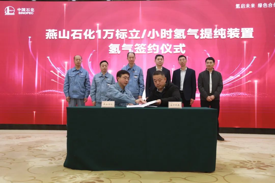 签约仪式结束后,曲宏亮等公司领导和与会嘉宾一起来到燕山石化1万标立/小时氢气提纯装置现场,听取装置及生产运行情况介绍,共同见证燕山石化30兆帕燃料电池氢气首车出厂发往中国石化北京石油昌平西关加氢站。