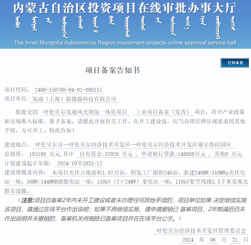 据悉,2024年6月21日,呼伦贝尔氢通风光制氢一体化项目获得备案,该项目单位为氢通(上海)新能源科技有限公司,建设地点在呼伦贝尔市--呼伦贝尔经济技术开发区--呼伦贝尔经济技术开发区谢尔塔拉园区,总投资185100万元,其中自有资金37020万元 , 申请银行贷148080万元 , 其他0万元。