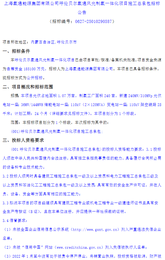 氢能汇(微信号:h2-2005)获悉,近日,上海氢通能源集团有限公司呼伦贝尔氢通风光制氢一体化项目施工总承包招标公告。