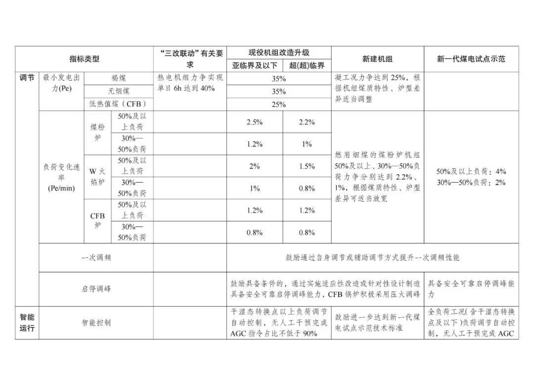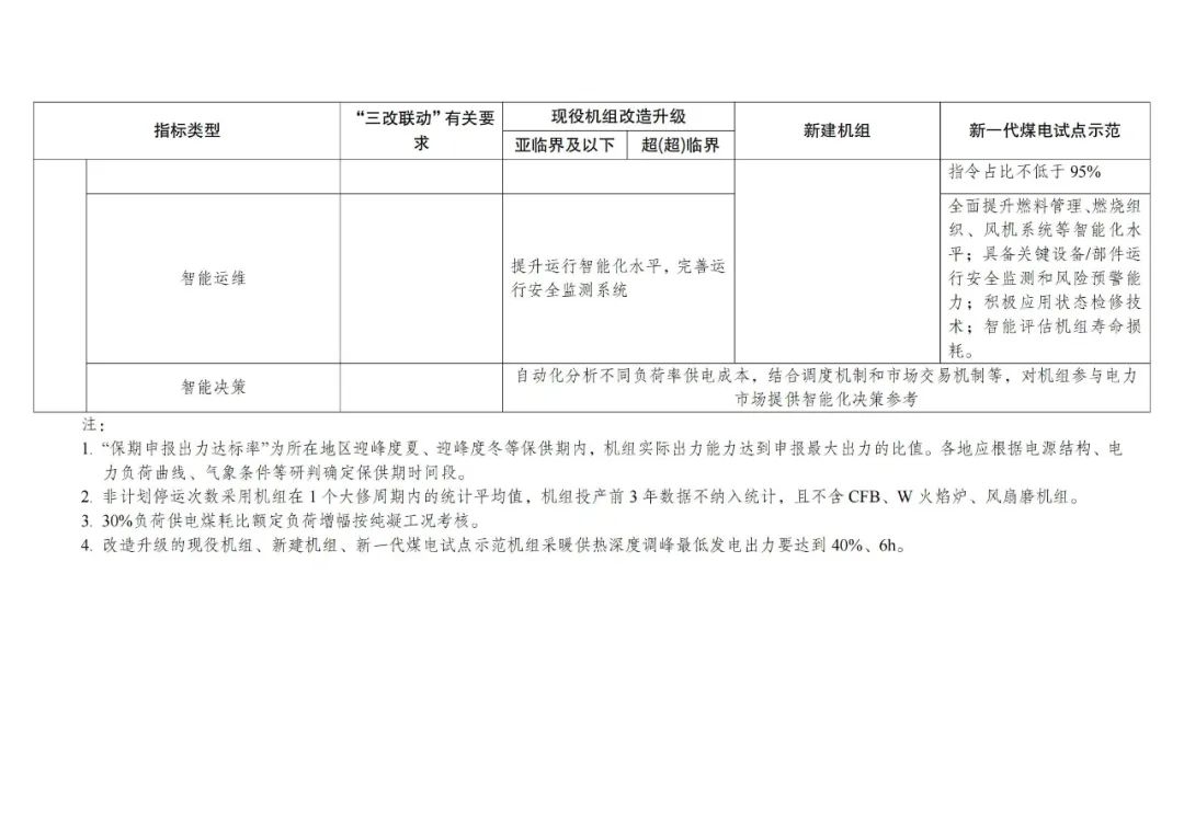 安全可靠是新一代煤电升级的基本前提。煤电机组在保供期发挥着不可替代的兜底保障作用,因此《实施方案》在安全可靠指标方面重点考虑保供期申报出力达标率、保供期非计划停运次数等2项评价指标。高效调节是新一代煤电升级的核心目标。新一代煤电的高效调节不仅是传统意义上的机组能效水平和深度调峰能力,而是扩展为供电煤耗、低负荷煤耗攀升幅度、深度调峰最小出力、负荷变化速率、一次调频、启停调峰等6项指标要求。除深度调峰最小出力和供电煤耗外,其他4项指标均为首次在产业政策中予以明确。低负荷煤耗攀升幅度用于衡量机组宽负荷运行能效水平,是新型电力系统下煤电机组频繁参与深度调峰场景下对机组能效的必然要求和发展趋势;负荷变化速率响应是构建新型电力系统的重要需求,按机组在不同负荷运行水平下的客观差异进行区分;一次调频能力是煤电机组重要涉网性能,结合煤电机组在深度调峰期间一次调频能力下降的客观实际,鼓励广大煤电机组通过自身调节或辅助调节方式提升机组一次调频能力。随着大规模新能源的接入,部分地区煤电启停调峰需求逐渐显现,但考虑到启停调峰运行的安全隐患,指标体系对于现役、新建机组以鼓励探索为主,试点示范需具备安全可靠启停调峰能力。清洁降碳是新一代煤电升级的重要方向。《实施方案》充分考虑了不同类型机组实际情况和区域资源条件的差异,对现役机组、新建机组和新一代煤电试点示范提出了差异化的碳减排实施标准。《实施方案》不强制要求所有机组实施低碳化改造建设,试点示范明确了度电碳排放强度的量化指标要求,积极推进现役机组实施低碳化改造,且新建机组应重点研究预留低碳化改造条件、鼓励具备条件的同步实施低碳化建设。智能运行是新一代煤电升级的重要支撑。《实施方案》提出了新一代煤电应重点聚焦智能控制、智能运维、智能决策等3个评价指标。其中,智能控制要求煤电机组强化负荷调节的自动化性能,提升自动控制的精准度并减少人工干预;智能运维要求提升机组运行智能化水平,强化安全监测、风险预警和寿命管理;智能决策是适应电力市场交易机制的重要能力,通过提升机组在市场化运行中的科学决策能力来降本增效。