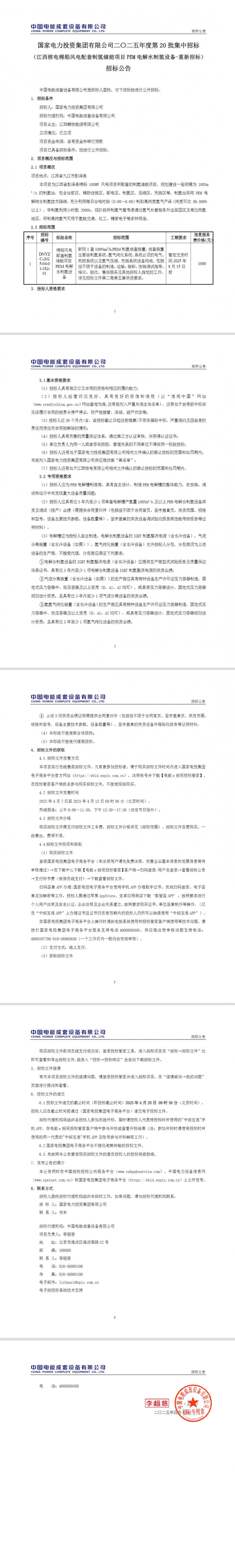 近日,国家电力投资集团有限公司二〇二五年度第20批集中招标(江西核电棉船风电配套制氢储能项目pem电解水制氢设备-重新招标)招标公告。