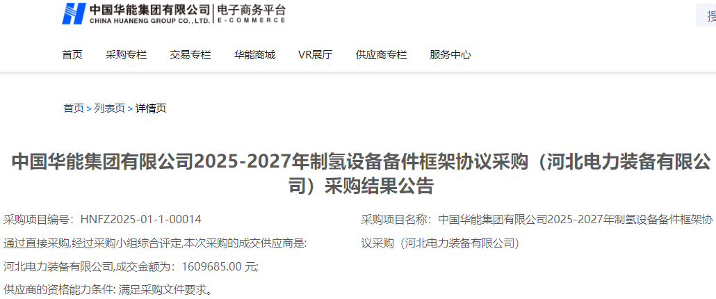 根据采购文件,中国华能集团有限公司2025-2027年制氢设备备件框架协议采购(河北电力装备有限公司)、(中船(邯郸)派瑞氢能科技有限公司)制氢设备备件均采购1台。