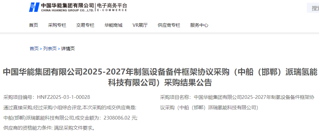 通过直接采购,中国华能集团有限公司2025-2027年制氢设备备件框架协议采购(中船(邯郸)派瑞氢能科技有限公司)采购成交供应商是中船(邯郸)派瑞氢能科技有限公司,成交金额为2308086.02元。