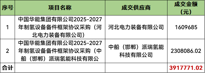 氢能汇(微信号:h2-2005)获悉,4月24日,中国华能集团有限公司2025-2027年制氢设备备件框架协议采购(河北电力装备有限公司)、(中船(邯郸)派瑞氢能科技有限公司)采购结果公告,成交金额总计3917771.02元。