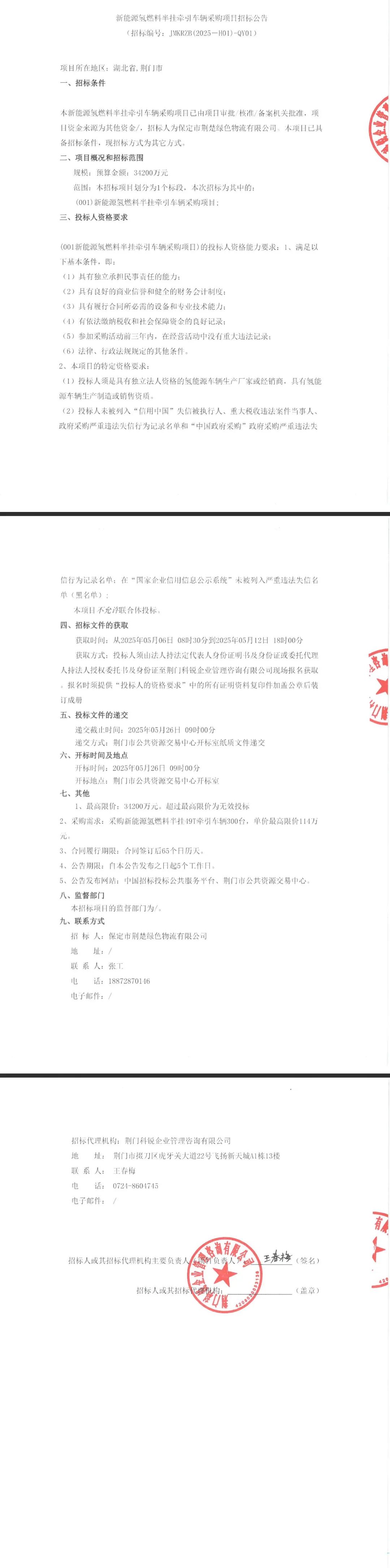 根据招标公告,本次招标采购新能源氢燃料半挂49t牵引车辆300台,单价最高限价114万元。
