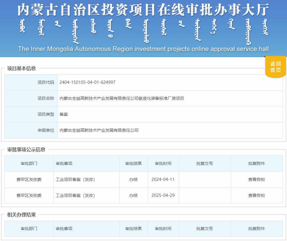 近日,内蒙古全益高新技术产业发展有限责任公司氢液化装备标准厂房项目获备案。