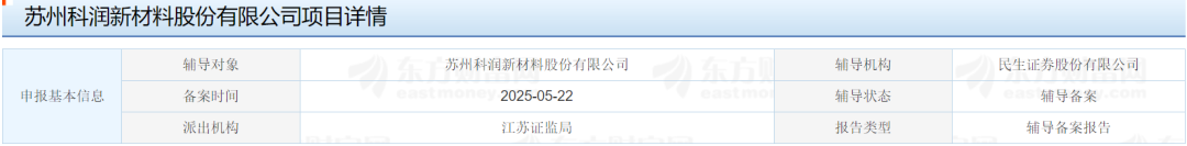 辅导备案报告显示,苏州科润新材料股份有限公司(简称“科润新材”)于2025年5月9日与民生证券股份有限公司(简称“民生证券”)签署了《苏州科润新材料股份有限公司与民生证券股份有限公司首次公开发行股票辅导协议》(简称“辅导协议”),聘请民生证券作为其首次公开发行股票的辅导机构。