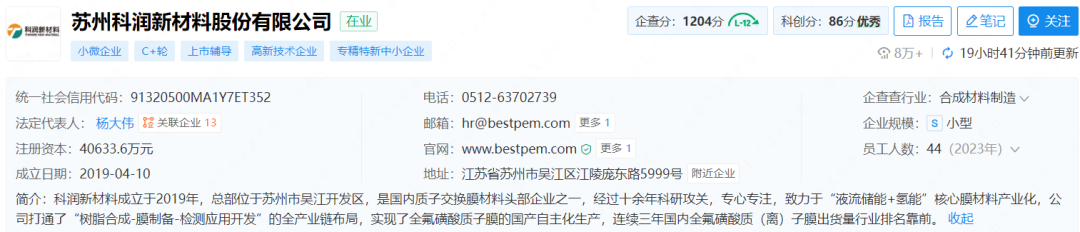 苏州科润新材料股份有限公司成立于2019年4月10日,总部位于苏州市吴江开发区,是国内质子交换膜材料头部企业之一,经过十余年科研攻关,专心专注,致力于“液流储能 氢能”核心膜材料产业化,公司打通了“树脂合成-膜制备-检测应用开发”的全产业链布局,实现了全氟磺酸质子膜的国产自主化生产,连续三年国内全氟磺酸质(离)子膜出货量行业排名靠前。