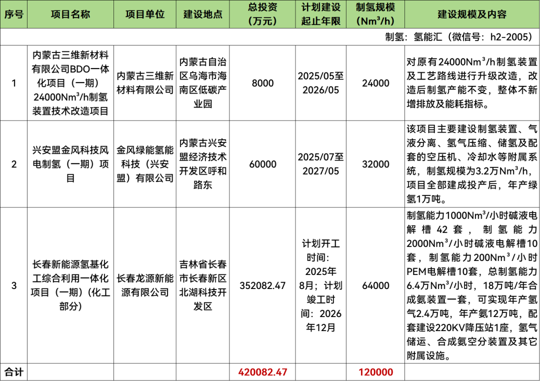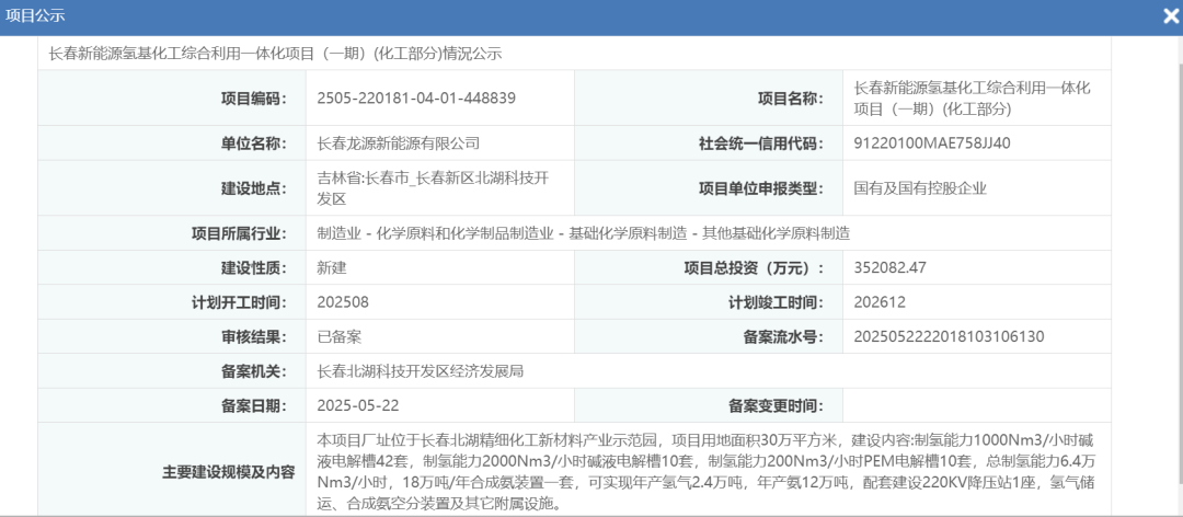 长春新能源氢基化工综合利用一体化项目(一期)(化工部分)厂址位于长春北湖精细化工新材料产业示范园,项目用地面积30万平方米,建设内容:制氢能力1000nm³/小时碱液电解槽42套,制氢能力2000nm³/小时碱液电解槽10套,制氢能力200nm³/小时pem电解槽10套,总制氢能力6.4万nm³/小时,18万吨/年合成氨装置一套,可实现年产氢气2.4万吨,年产氨12万吨,配套建设220kv降压站1座,氢气储运、合成氨空分装置及其它附属设施。项目单位为长春龙源新能源有限公司,项目总投资352082.47万元。项目计划2025年8月开工,2026年12月竣工。