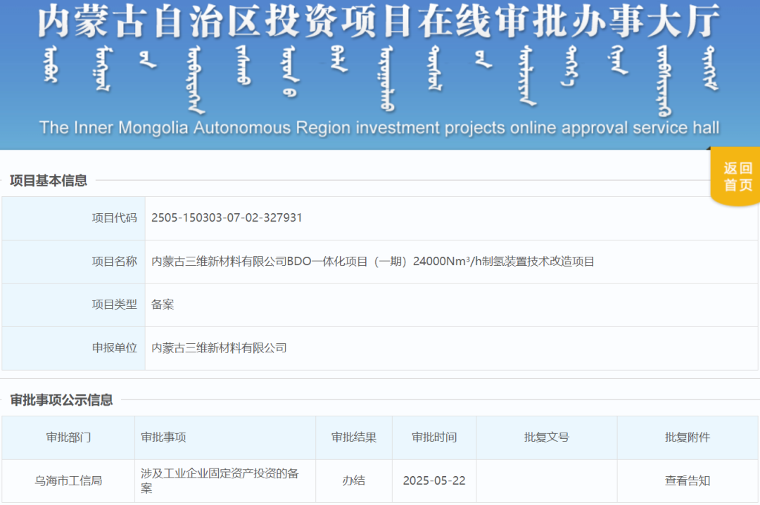您提交的 内蒙古三维新材料有限公司bdo一体化项目(一期)24000nm³/h制氢装置技术改造项目 涉及工业企业固定资产投资的备案项目,符合产业政策和市场准入标准,准予备案。请据此开展有关工作。在开工建设前,应当办理法律法规要求的其他手续,方可开工。特此告知!