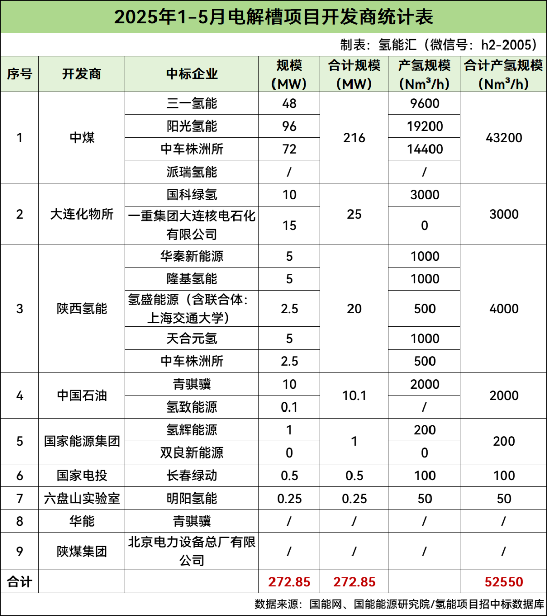 2025年1-5月,排名前三的开发商分别是中煤、大连化物所、陕西氢能。