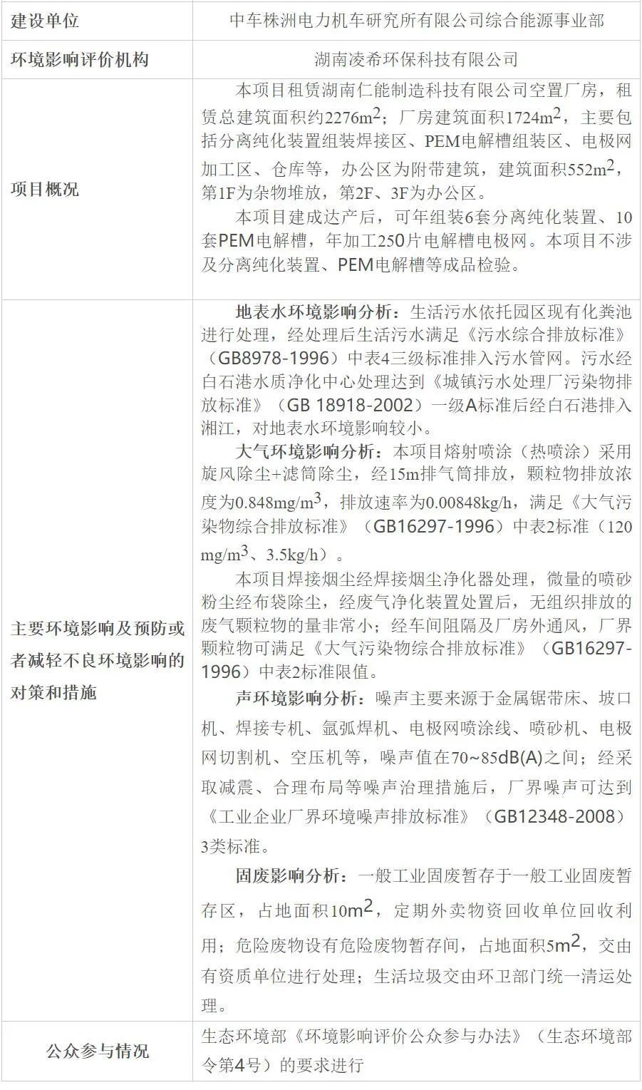根据公示,pem电解槽、分离纯化装置组装及电极网加工项目株洲市石峰区株洲高新技术产业开发区田心片区中车大道以南,博雅路以东,建设单位为中车株洲电力机车研究所有限公司综合能源事业部。