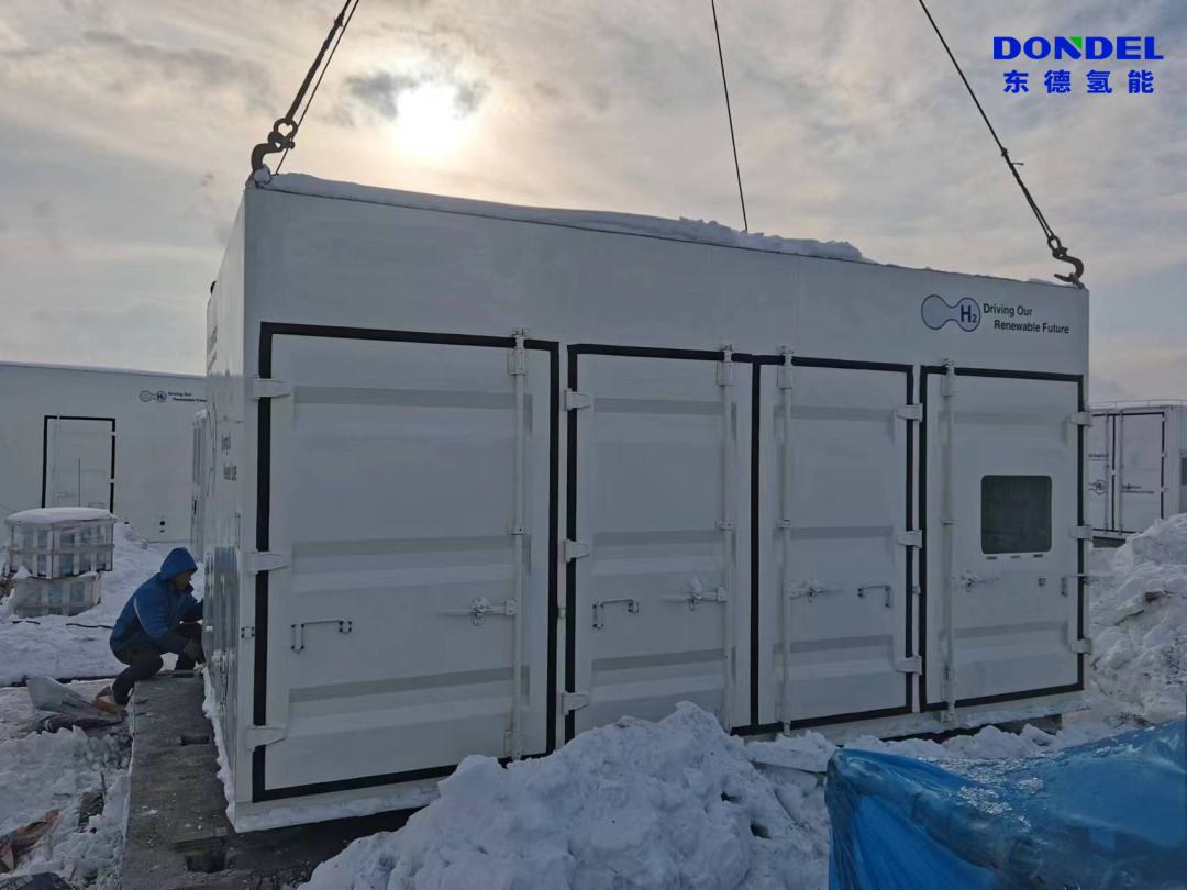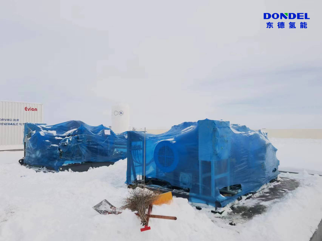 针对勃利县当地气候特点,东德氢能进行了定制化环境适应性改造:为隔膜压缩机组增加箱体,有效阻隔雨水侵蚀;同时提升箱体保温性能,并在箱体内安装暖气片,接入采暖水以保证箱体内温度,确保两台隔膜压缩机组可以在恶劣环境下的稳定运行。