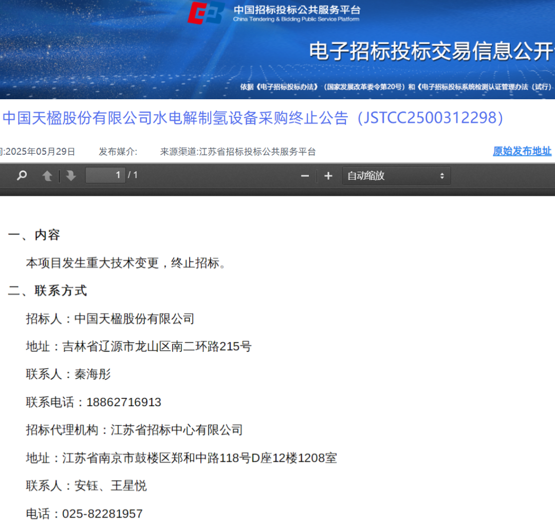 能源圈获悉,5月29日,中国天楹股份有限公司水电解制氢设备采购终止公告。