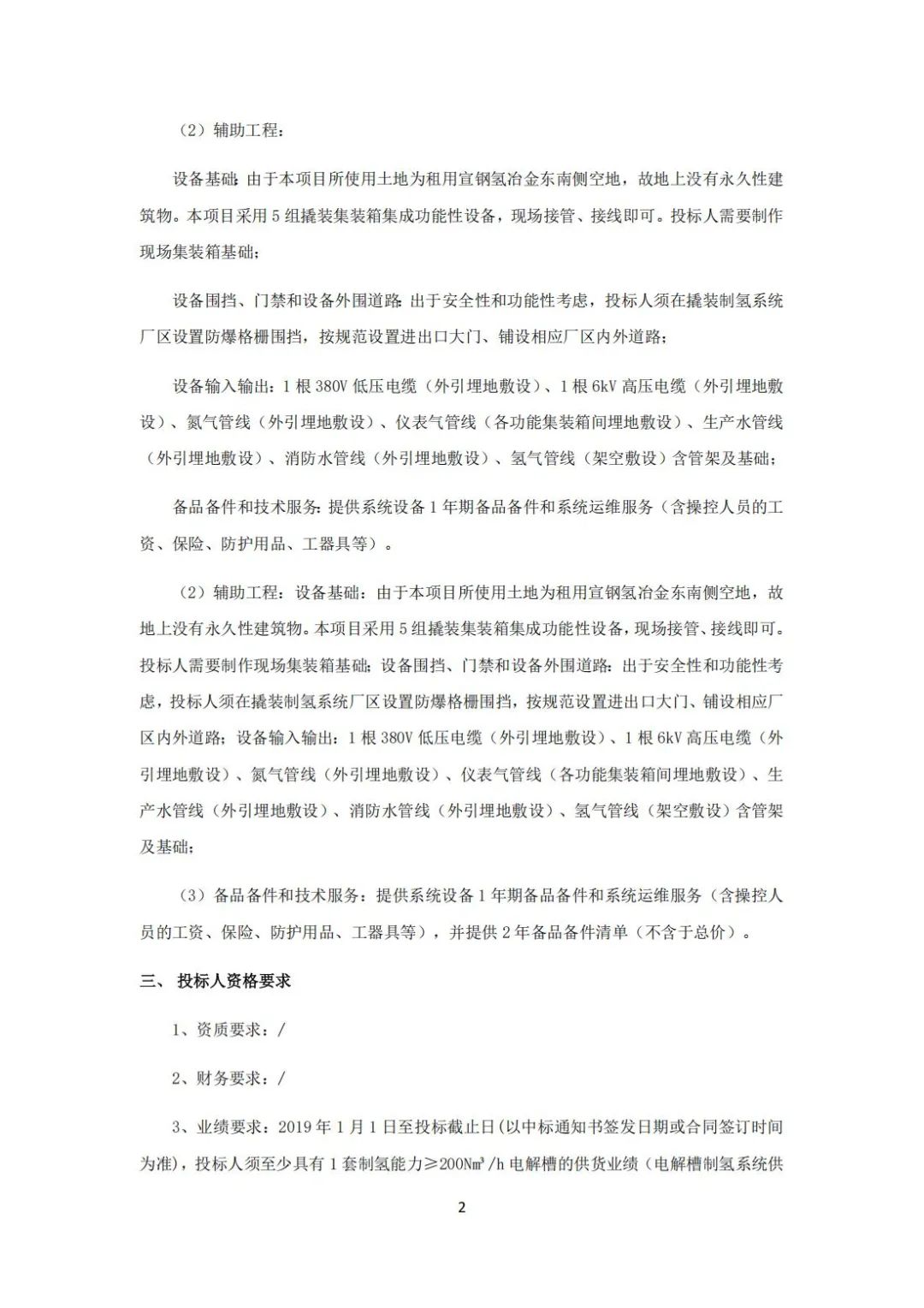 范围:(1)系统供货:提供1部套完整撬装多集装箱组合200nm³/h碱式电解水制氢系统设备,包括但不限于:1套200nm³/h撬装制氢设备(包含:1台200nm³/h电解槽、1套气液分离装置、1套氢气纯化装置)、1套制氢电源(主要包括整流变压器、整流器、整流器纯水冷却器、铜排)、1套预制箱式变电站(主要包括高压开关柜、电力变压器)、plc控制柜、工程师站、纯水机组、循环水系统(含循环水塔、循环水泵、循环水箱)、氢气缓冲罐(外置)、配碱箱、补水泵、配碱泵、构网电压支撑型储能(500kw/1165kwh)系统、消防系统、集装箱和生产区域照明、视屏监控系统、上级 6kv/0.4kv配电电源(主要包括上级电源配电柜改造、供电电缆)、防雷设施(含避雷针)等。