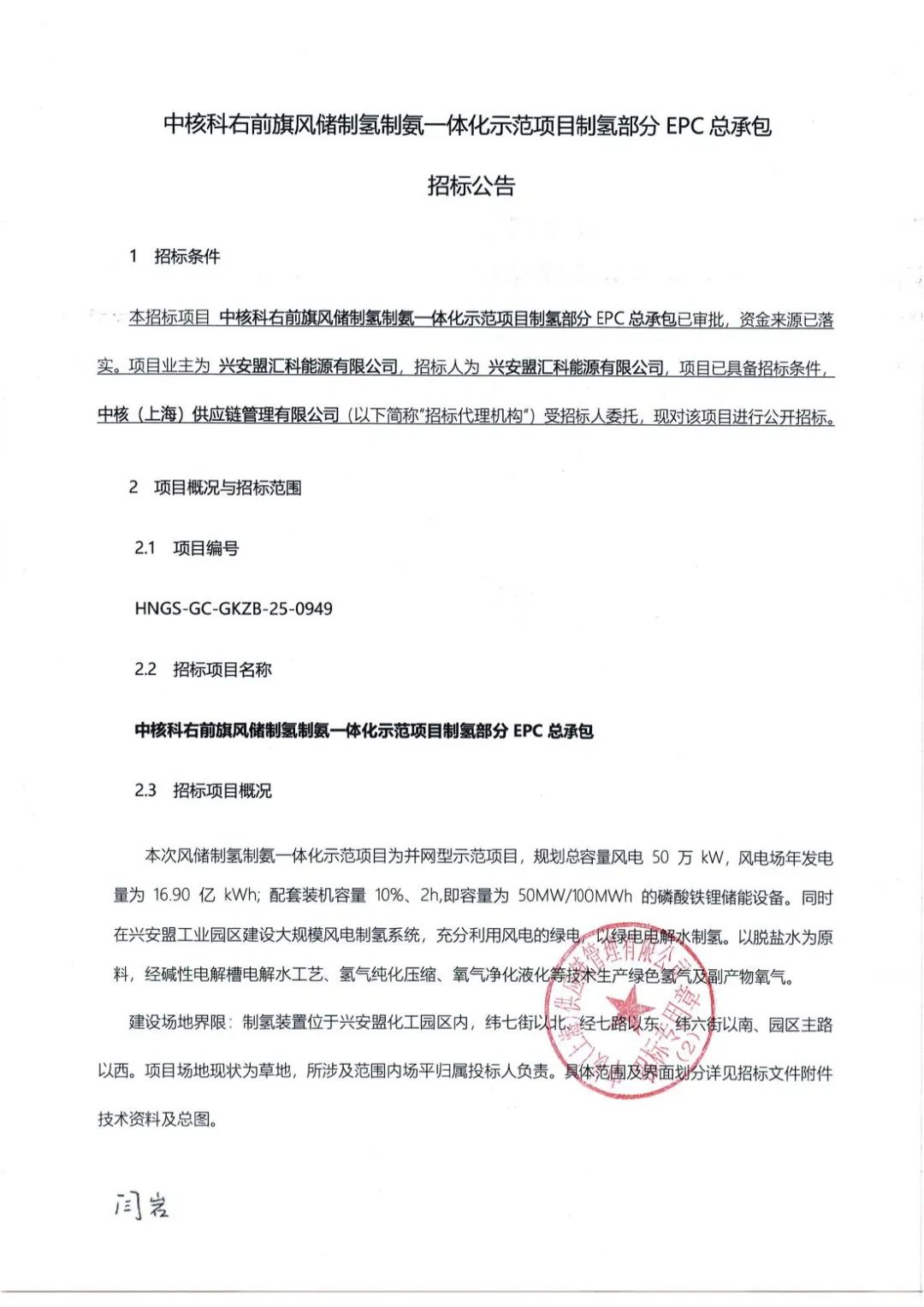 根据招标公告,中核科右前旗风储制氢制氨一体化示范项目制氢部分epc总承包,制氢装置位于兴安盟化工园区内,纬七街以北、经七路以东、纬六街以南、园区主路以西。