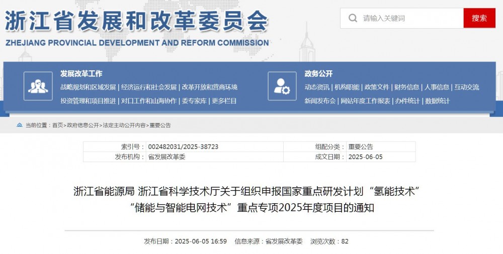 6月5日,浙江省发改委发布《浙江省能源局 浙江省科学技术厅关于组织申报国家重点研发计划“氢能技术”“储能与智能电网技术”重点专项2025年度项目的通知》,本批次“氢能技术”“储能与智能电网技术”重点专项原则上由省能源局组织推荐。请各地及时将有关情况传达申报单位,并指导申报单位于2025年7月2日12:00前通过国家科技管理信息系统上报至省能源局。