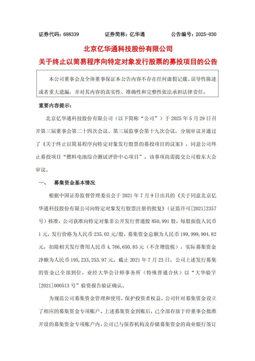 氢能汇获悉,近日,北京亿华通科技股份有限公司(简称:亿华通)发布《关于终止以简易程序向特定对象发行股票的募投项目的公告》。