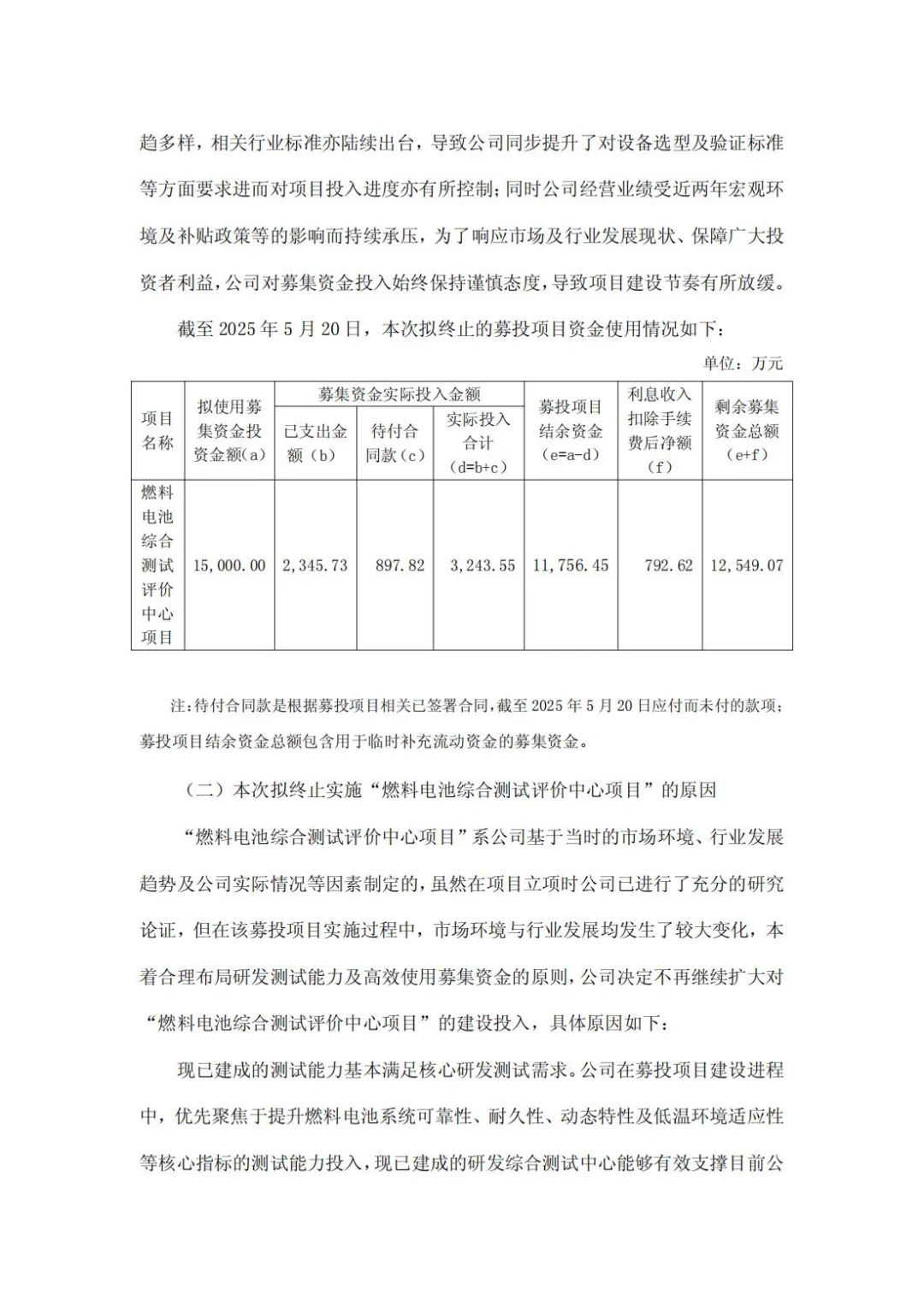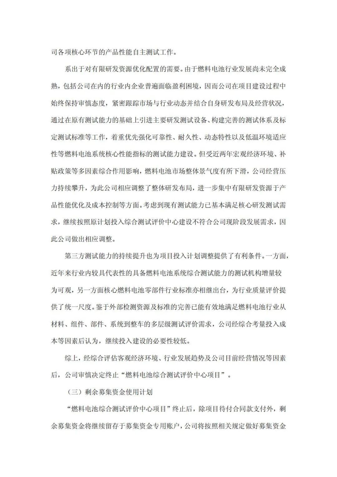 第三方测试能力的持续提升也为项目投入计划调整提供了有利条件。一方面,近年来行业内较具代表性的具备燃料电池系统综合测试能力的测试机构增量较为可观,另一方面核心燃料电池零部件行业标准亦相继出台,为行业质量评价提供了统一尺度。鉴于外部检测资源及标准的完善已能有效地满足燃料电池行业从材料、组件、部件、系统到整车的多层级测试评价需求,公司经综合考量投入成本等因素后认为,继续投入建设的必要性较低。