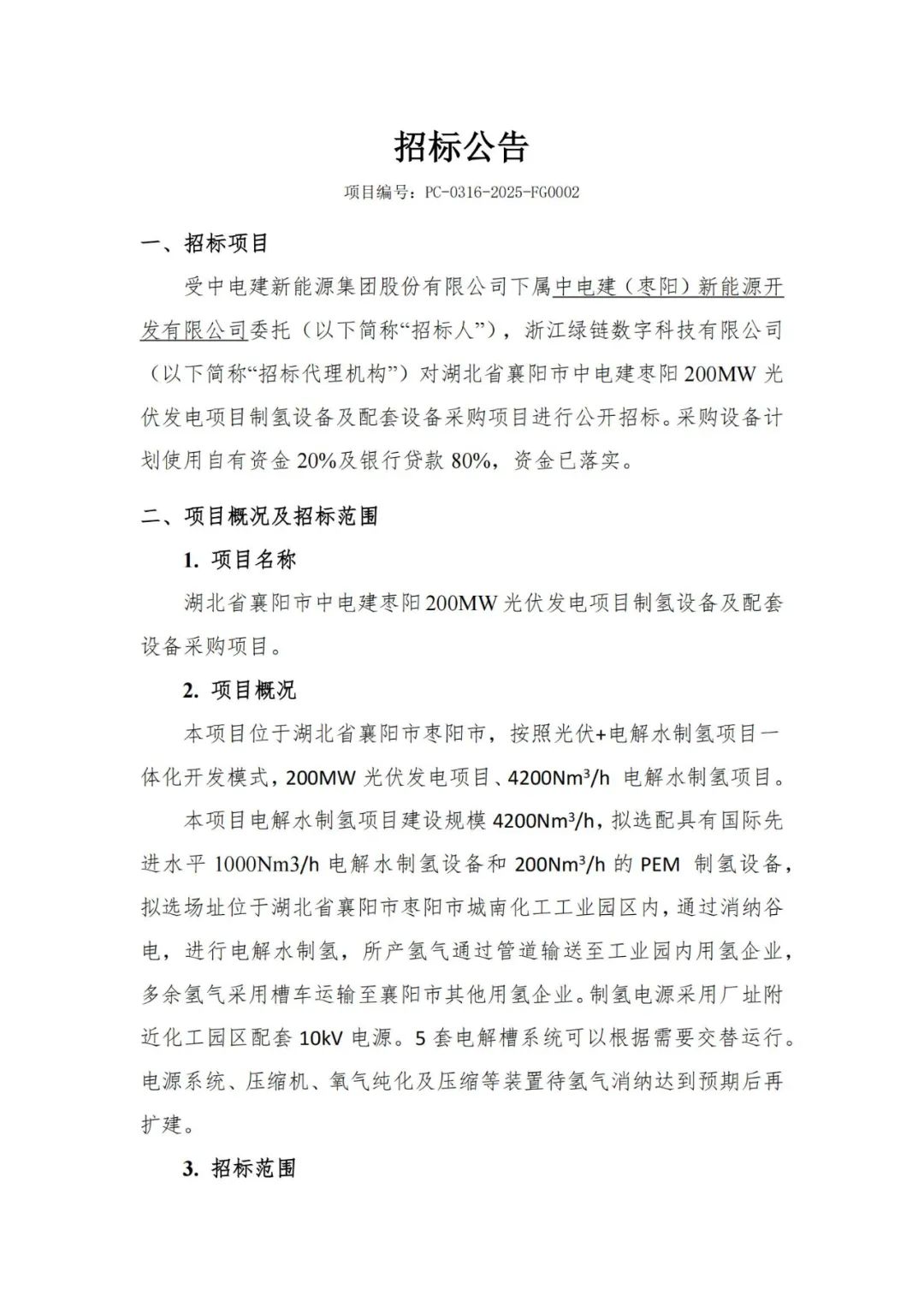 氢能汇获悉,6月9日,中国电建湖北省襄阳市中电建枣阳200mw光伏发电项目制氢设备及配套采购项目招标公告。