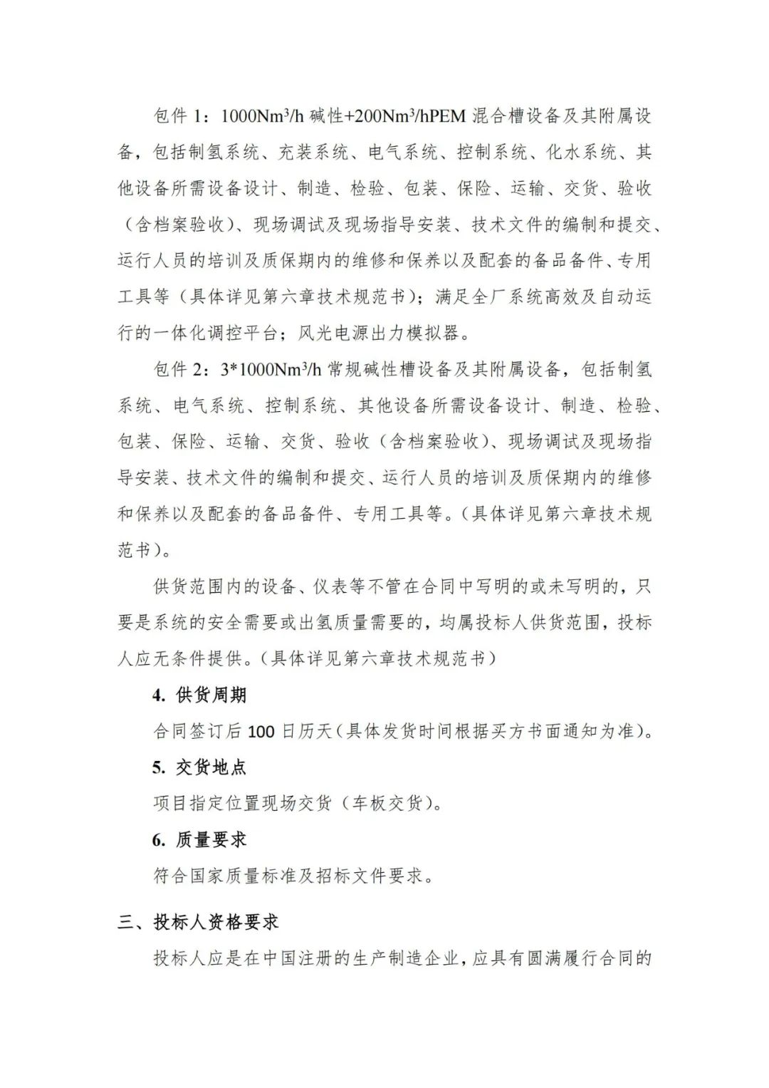 包件 2:3*1000nm³/h常规碱性槽设备及其附属设备,包括制氢系统、电气系统、控制系统、其他设备所需设备设计、制造、检验、包装、保险、运输、交货、验收(含档案验收)、现场调试及现场指导安装、技术文件的编制和提交、运行人员的培训及质保期内的维修和保养以及配套的备品备件、专用工具等。