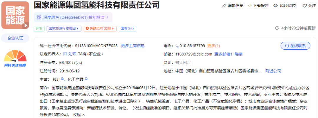 氢能汇获悉,6月6日,国家能源集团氢能科技有限责任公司工商信息变更。