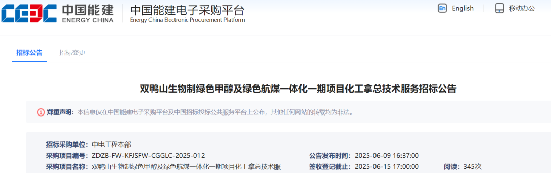 氢能汇获悉,近日,双鸭山生物制绿色甲醇及绿色航煤一体化一期项目化工拿总技术服务招标公告。