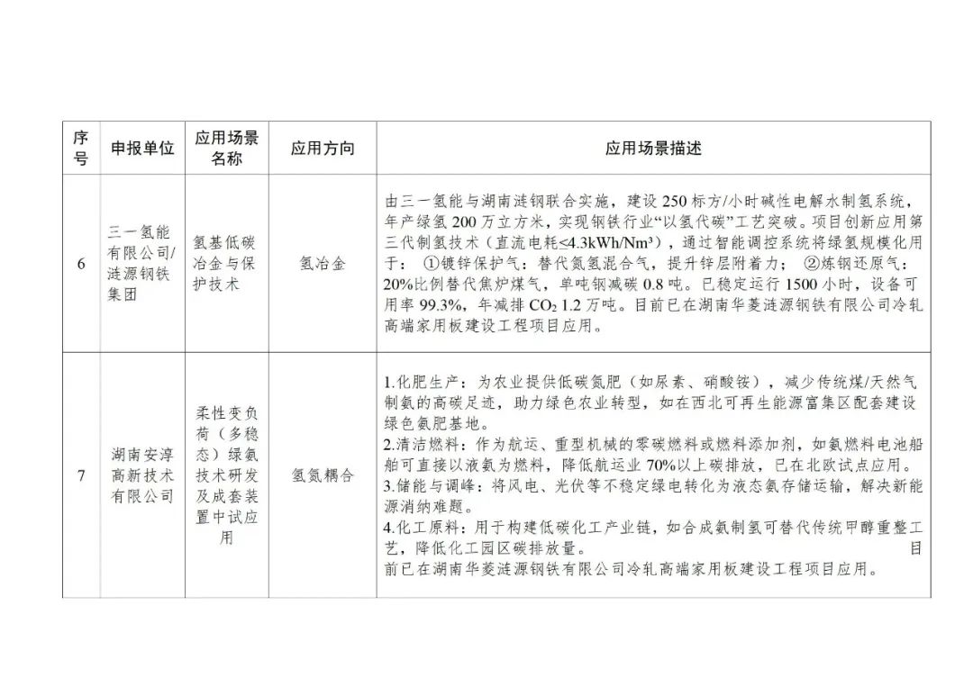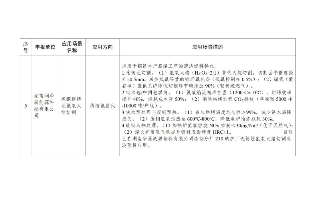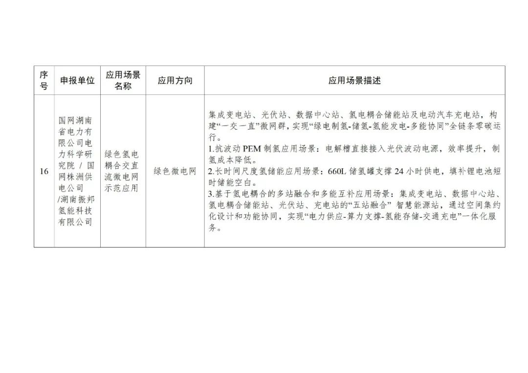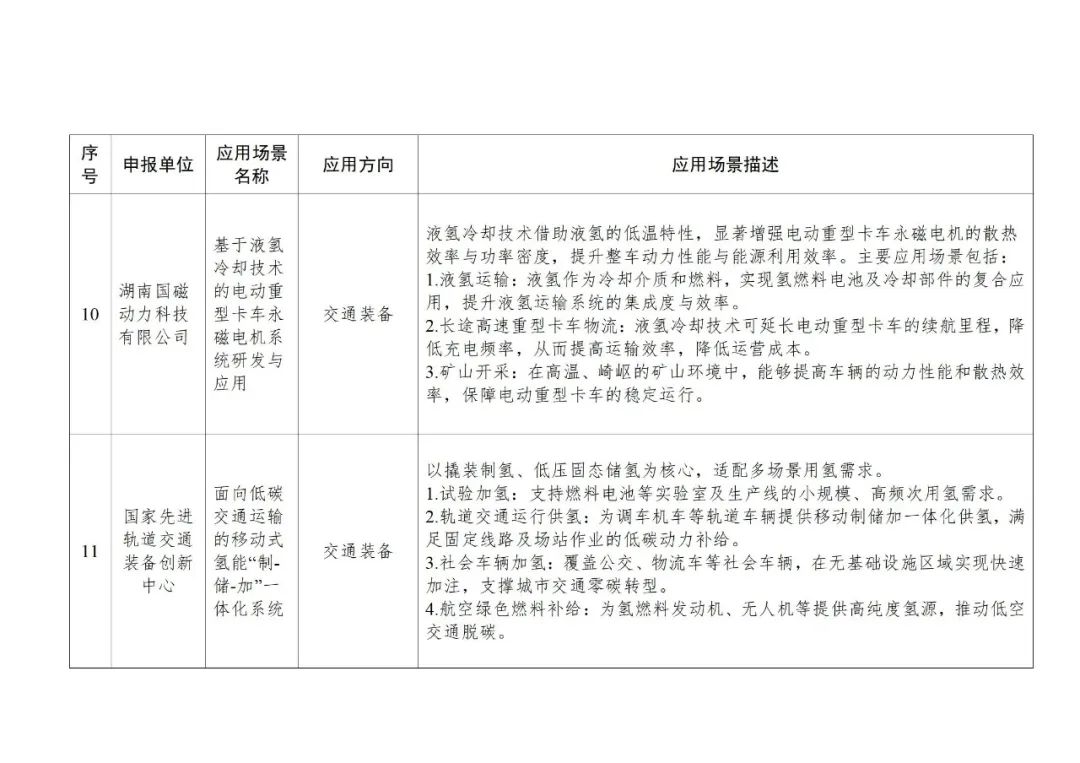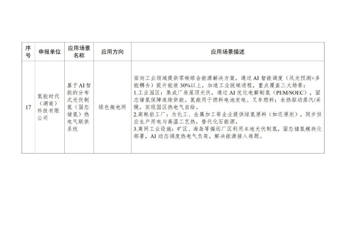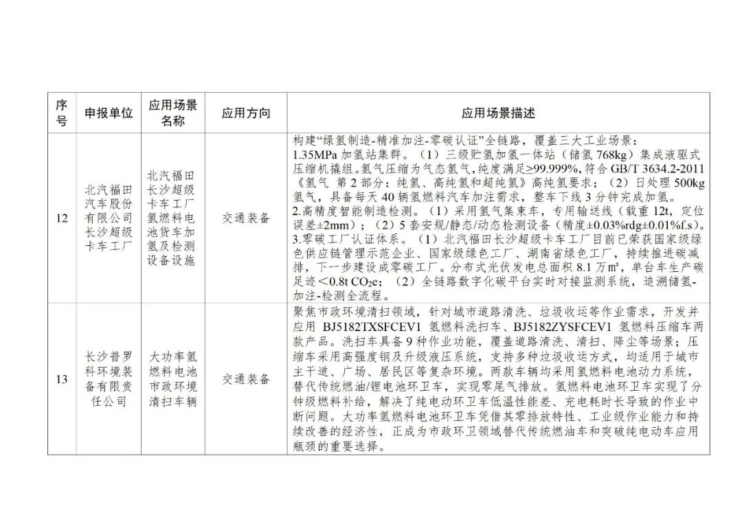 应用场景有17个:氢能火焰切割,工业传统燃料锅炉加氢助燃,基于绿电制氢的日用陶瓷低碳燃烧技术应用场景,pem电解水制氢(绿氢生产特种陶瓷),炼钢连铸坯氢氧火焰切割,氢基低碳冶金与保护技术,柔性变负荷(多稳态)绿氨技术研发及成套装置中试应用,基于氢能源动力的大功率混合动力调车机车(轨道交通车辆),绿电制氢加氢一体站及氢交通示范项目,基于液氢冷却技术的电动重型卡车永磁电机系统研发与应用,面向低碳交通运输的移动式氢能“制-储-加”一体化系统,北汽福田长沙超级卡车工厂氢燃料电池货车加氢及检测设备设施,大功率氢燃料电池市政环境清扫车辆,公交车、卡车和轨道交通等以电驱动的交通工具领域,大功率金属双极板燃料电池城市客车,绿色氢电耦合交直流微电网示范应用,基于ai智能的分布式光伏制氢(固态储氢)热电气联供系统。