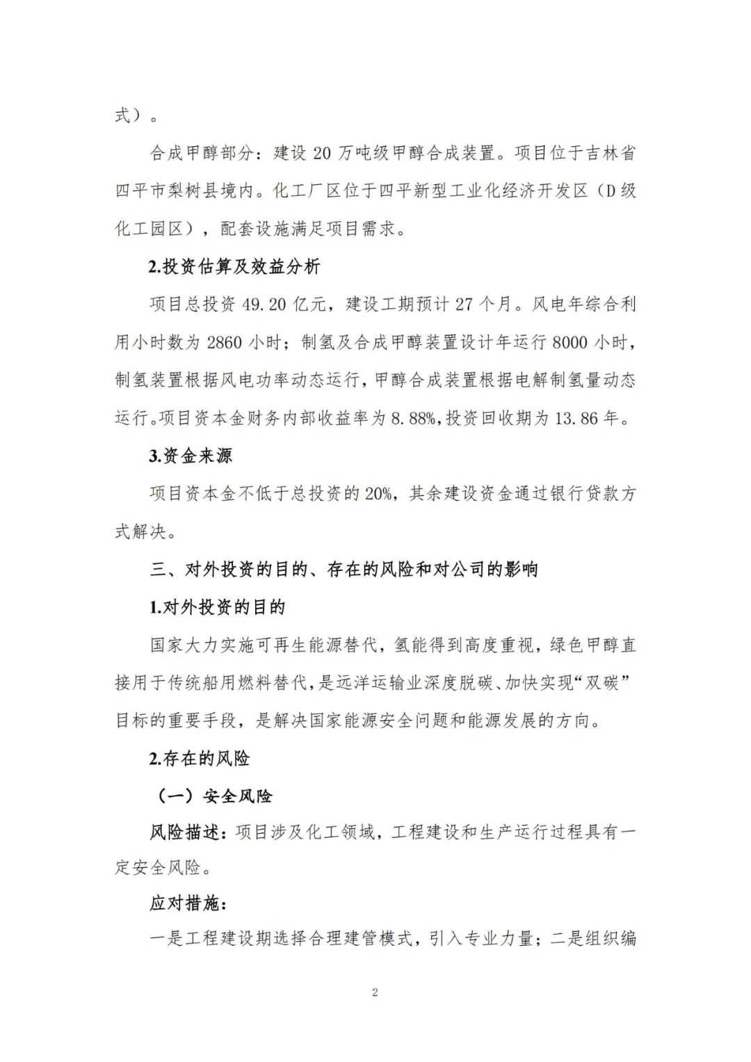 项目建设工期预计27个月。风电年综合利用小时数为2860小时;制氢及合成甲醇装置设计年运行8000小时,制氢装置根据风电功率动态运行,甲醇合成装置根据电解制氢量动态运行。项目资本金财务内部收益率为8.88%,投资回收期为13.86年。