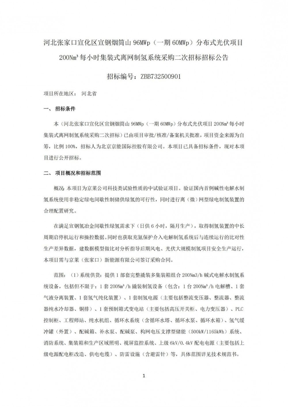 近日,河北张家口宣化区宣钢烟筒山96mwp(一期60mwp)分布式光伏项目200nm³每小时集装式离网制氢系统采购二次招标招标公告。