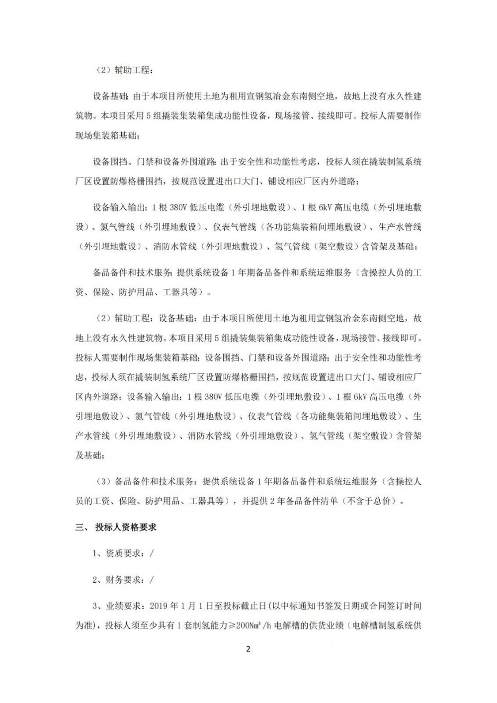 范围:(1)系统供货:提供1部套完整撬装多集装箱组合200nm³/h碱式电解水制氢系统设备,包括但不限于:1套200nm³/h 撬装制氢设备(包含:1台200nm³/h 电解槽、1套气液分离装置、1套氢气纯化装置)、1套制氢电源(主要包括整流变压器、整流器、整流器纯水冷却器、铜排)、1套预制箱式变电站(主要包括高压开关柜、电力变压器)、plc控制柜、工程师站、纯水机组、循环水系统(含循环水塔、循环水泵、循环水箱)、氢气缓冲罐(外置)、配碱箱、补水泵、配碱泵、构网电压支撑型储能(500kw/1165kwh)系统、消防系统、集装箱和生产区域照明、视屏监控系统、上级 6kv/0.4kv 配电电源(主要包括上级电源配电柜改造、供电电缆)、防雷设施(含避雷针)等。
